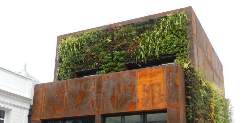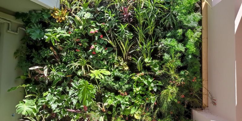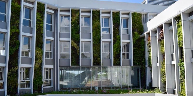150 m² de parois végétalisées installées sur un mur extérieur. Gamme CRÉATION. Bâtiment ERP